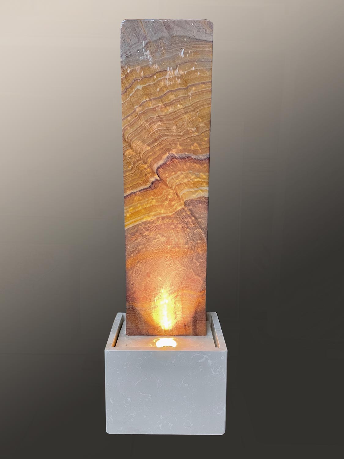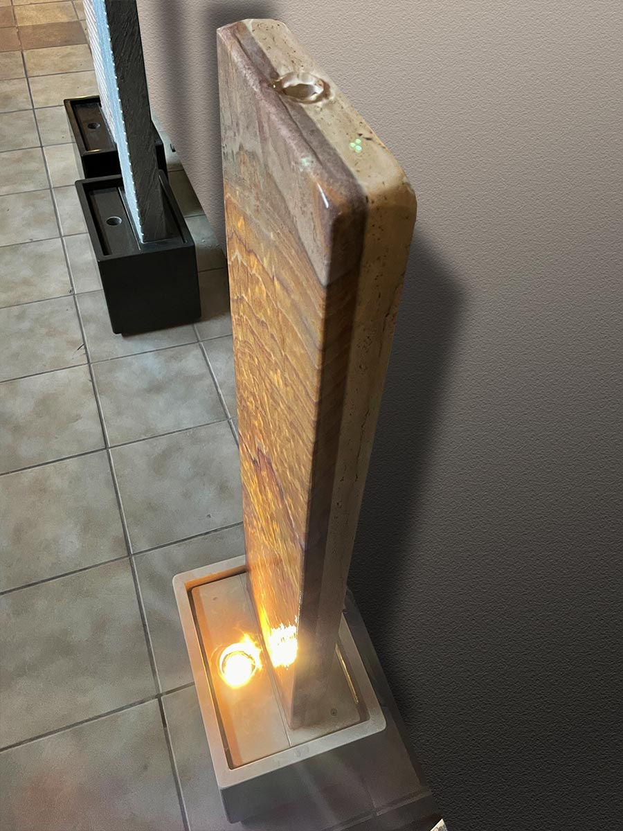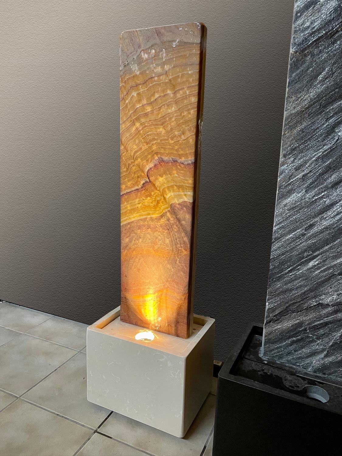 Dieser Brunnen aus dem wundersamen Quarzsandstein “Rainbow-India” begeistert durch seine angenehmen warmen Farbtöne und seine feine Maserung. Die Rückwand ist aus einer robusten 3cm starken Travertinplatte gemacht.