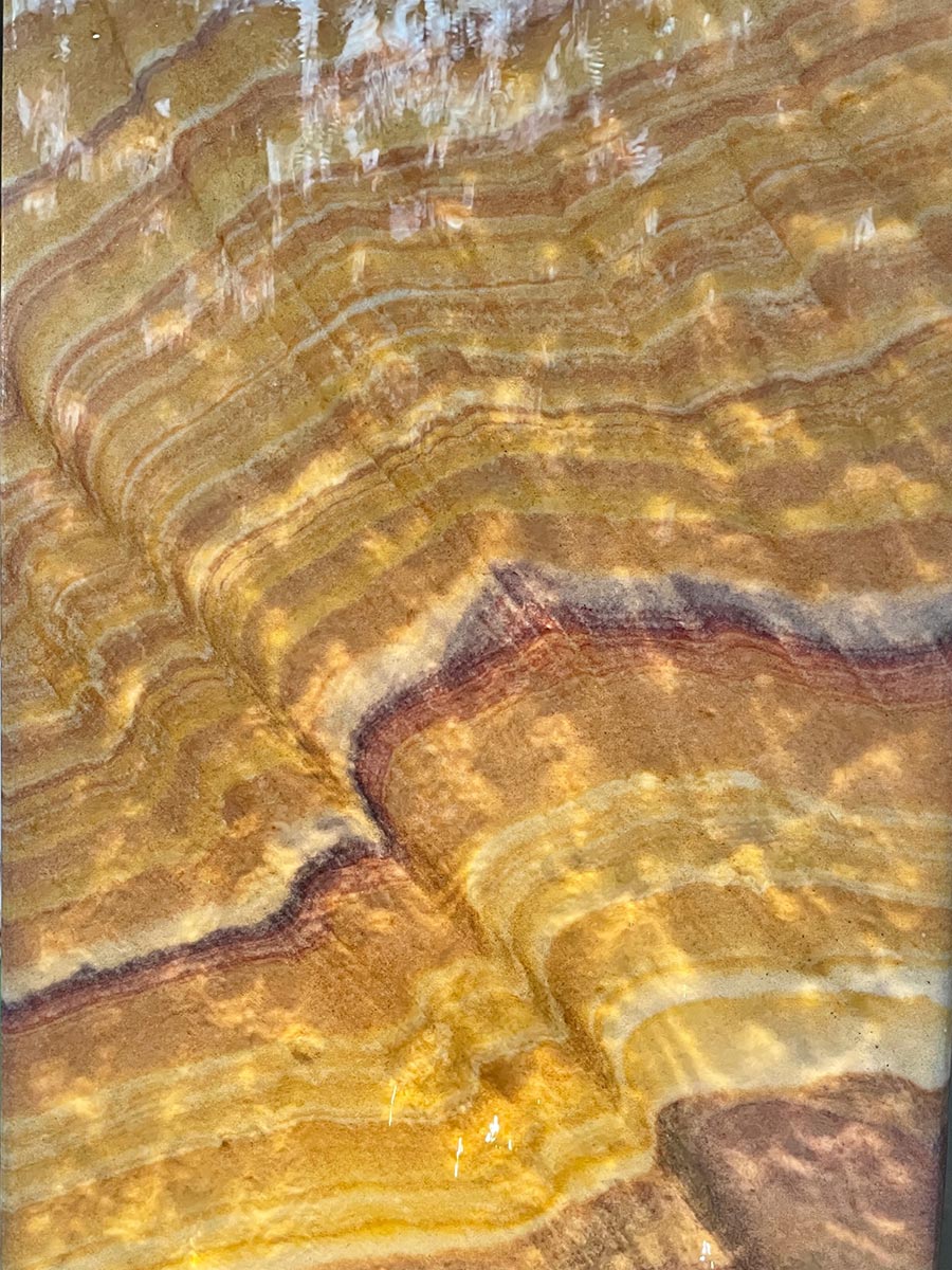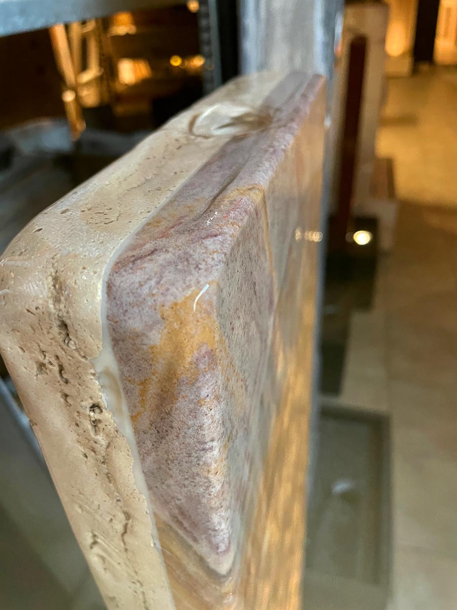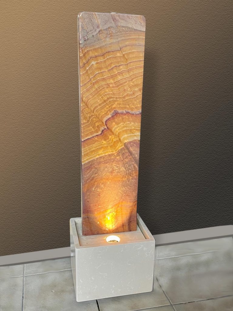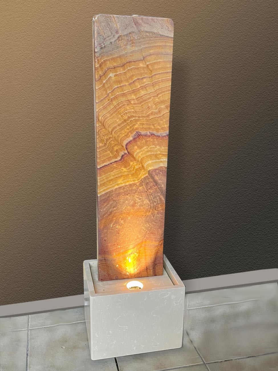 Dieser Brunnen aus dem wundersamen Quarzsandstein “Rainbow-India” begeistert durch seine angenehmen warmen Farbtöne und seine feine Maserung. Die Rückwand ist aus einer robusten 3cm starken Travertinplatte gemacht.